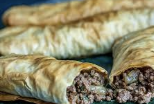 Börek is a family of baked filled pastries made of a thin flaky dough such as phyllo or yufka, of Anatolian origins and also found in the cuisines of the Balkans, the Caucasus, Levant, Mediterranean, and other countries in Eastern Europe