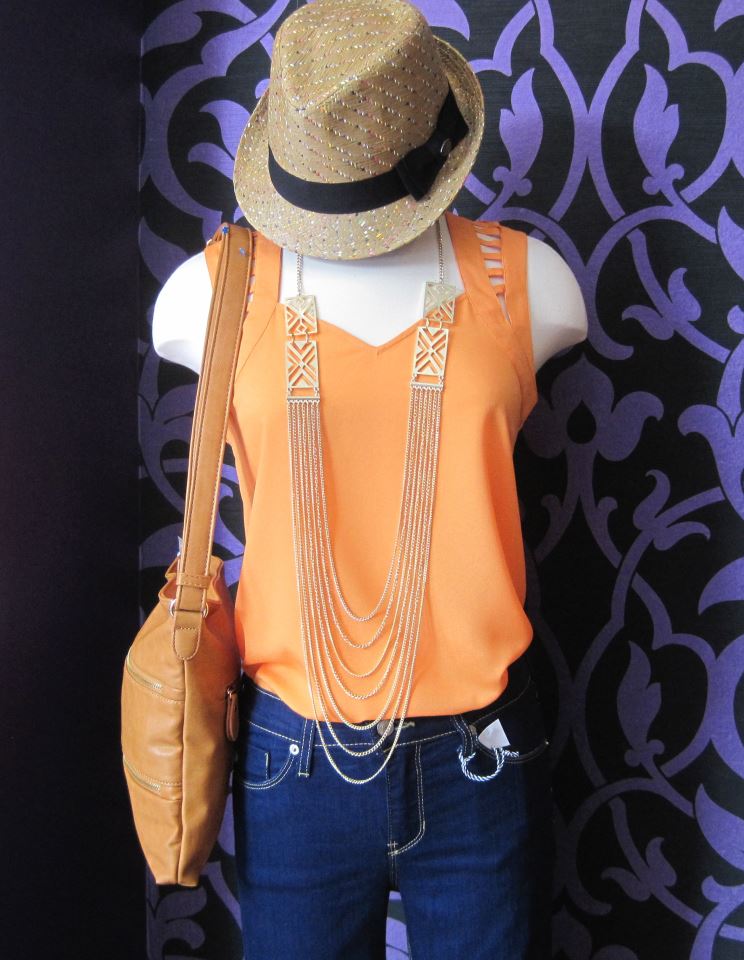 Study in weekday casual: Naked Zebra Back Track Tank in Canary paired with our new Just USA High Waist Skinny Jeans in Marine. Add a fedora and geometric necklace for perfection.