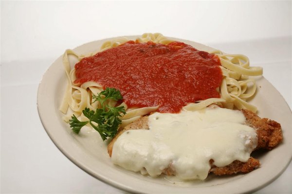 Breaded chicken topped with marinara sauce and fresh mozzarella cheese.