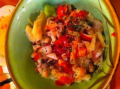Chirashizushi (ちらし寿司, "scattered sushi") is a bowl of sushi rice topped with a variety of sashimi and garnishes