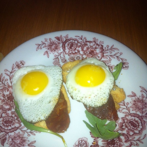 Toast points, sobrasada, caramelized onions, mahón cheese, quail eggs.