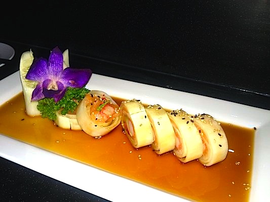 Salmon, crab, avocado, tobiko wrap with cucumber sheet.