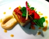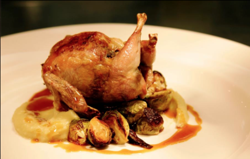 Roasted Quail stuffed with brioche, pancetta, sage and pistachio; sweet potato purée with brussels sprouts and sauce “à l’orange."