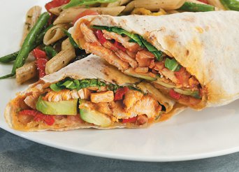 Tuscan Chicken Rollino! Fresh grilled marinated chicken in a Tuscan sun-dried tomato pesto sauce, avocado slices, diced plum tomatoes and arugula rolled in our fresh-baked flatbread and toasted to perfection. Served with a side of our new pasta salad.